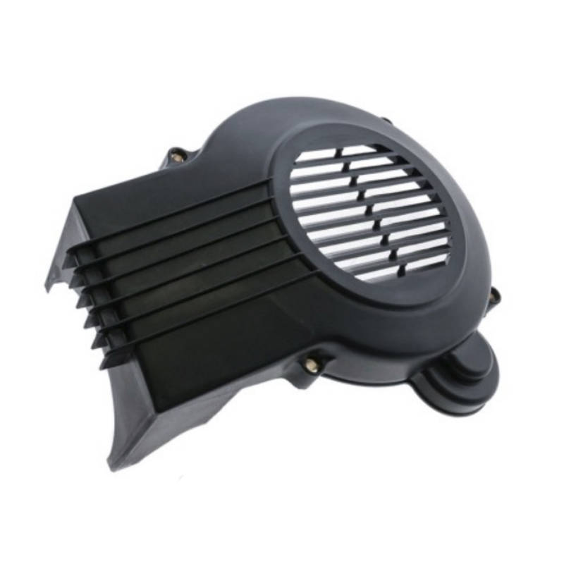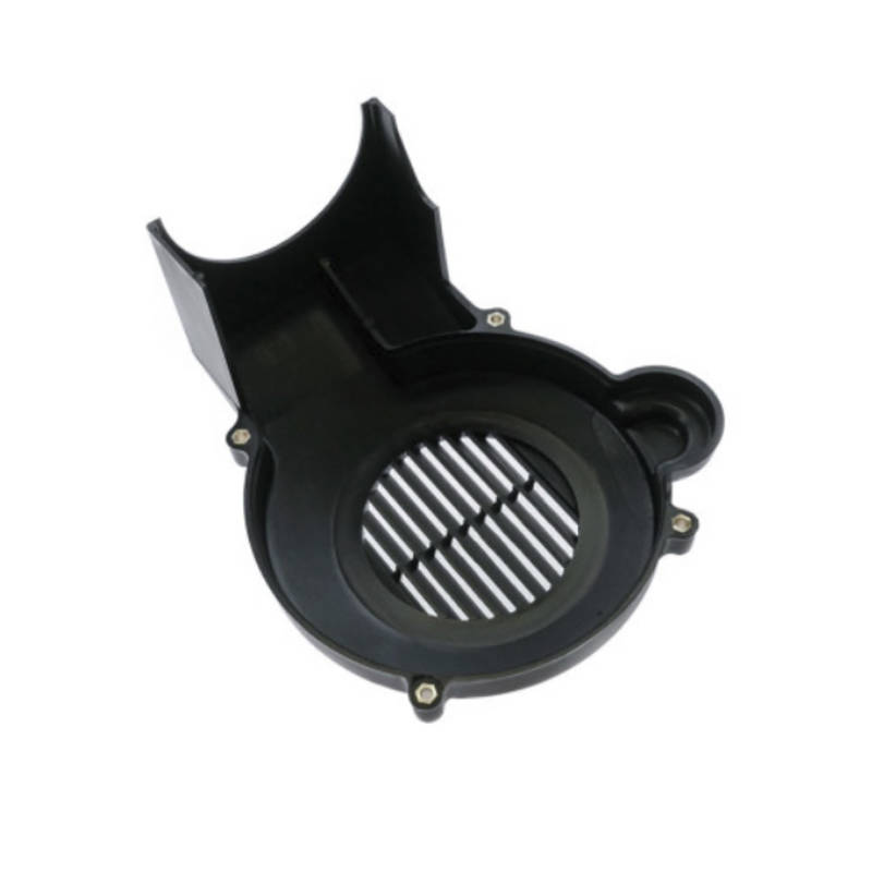 Schwarze Gebläsehaube aus Hartkunststoff mit Gewindeeinsätzen aus Messing.