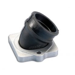 Für die wuchtigen Dellorto-VHST-Vergaser bietet Malossi nun einen zweiteiligen Ansaugstutzen an, der aus einer Grundplatte und einem flexiblen, gewinkelten Gummistück besteht, welches beim Verschrauben zwischen Grundplatte und Motoreinlass gequetscht wird. Der Ansaugstutzen hat einen Durchlass von 30mm und eine Anschlussweite von 35mm. Hier handelt es sich um die Ausführung in Viton®.