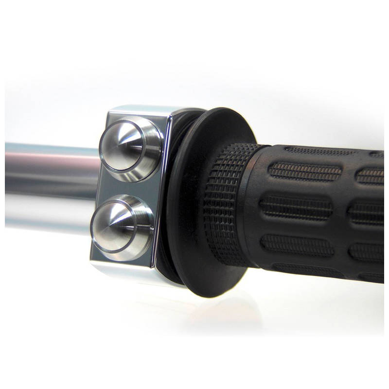 Zwei (bei 3 Taster-Einheit eine Schraube) versenkte M5 Befestigungsschrauben aus Edelstahl klemmen die Tastersteuerung sicher und stabil an jede Lenkstange.