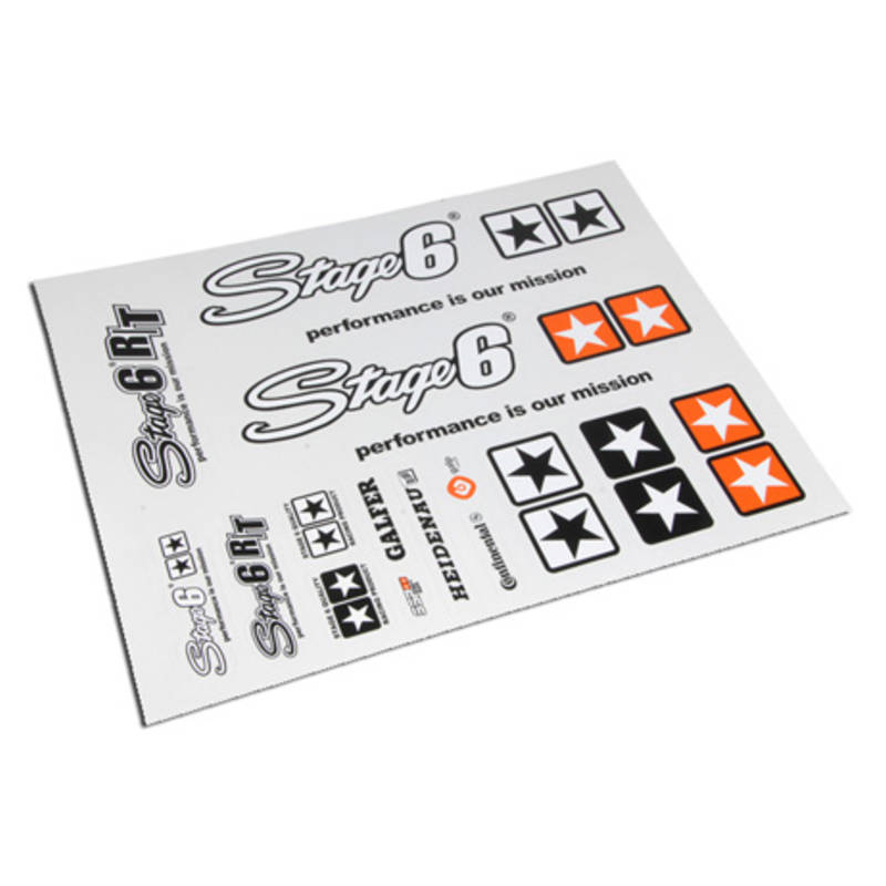 Neue Stage6-Maxi-Stickerbögen im DIN-A2- und -A4-Format. Jetzt mit Stage6-R/T-Logo. Ihr könnt aus 2 Ausführungen wählen, weiß (für dunkel lackierte Flächen) oder schwarz (für hell lackierte Flächen); beim kleinen Set gibt es nur eine Farbvariante.