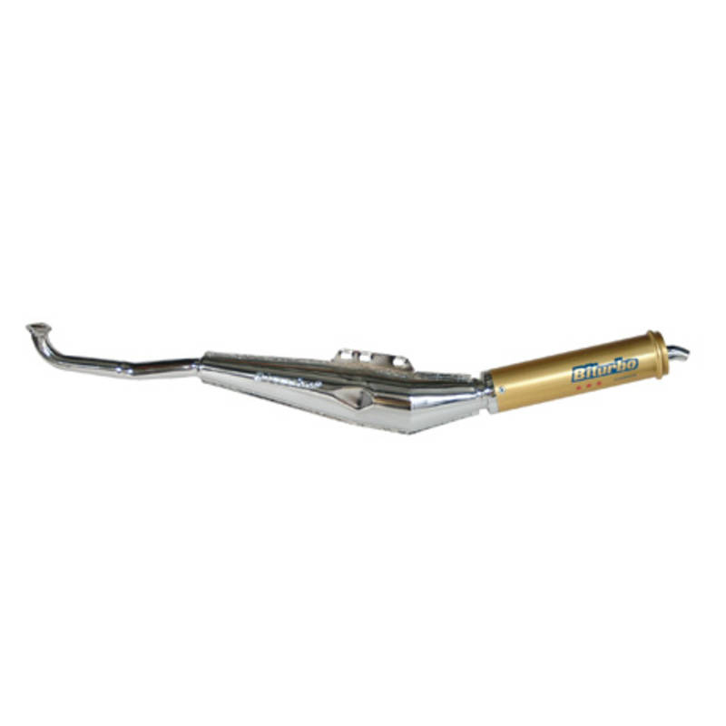 Vollverchromter Rennauspuff mit goldenem Schalldämpfer von BITURBO. Absoluter Blickfang mit guter Leistungssteigerung. Ideal für kleinere Kits bis 65ccm.