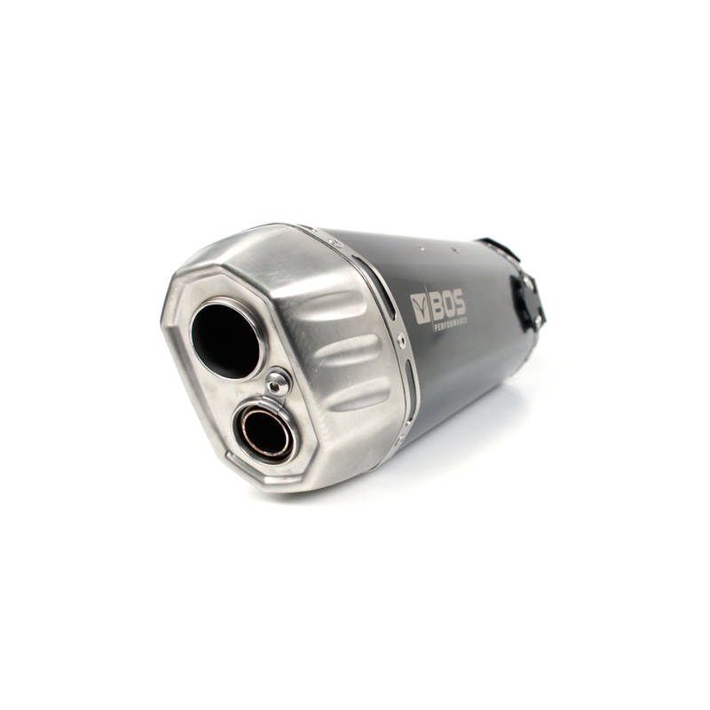 BOS Endschalldämpfer DESERT FOX, der Dämpfer für Enduros, mit mechanisch verstellbaren DB- KILLER (DB MAKER)/Soundregler. Komplett aus Edelstahl gefertigt in drei Ausführungen lieferbar: Carbon-steel, Edelstahl matt und schwarz