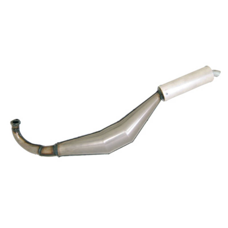 Die Racing von Simonini ist die wohl leistungsstärkste Rennauspuffanlge für Maxi-Motoren. Sie eignet sich besonders für die grösseren Kits über 63ccm und insbesondere für 75ccm Zylinder wo sie eine beeindruckende Leistung abgiebt. Die Referenzanlage auf Rennmofas ! Die Standartausführung ist klarlackiert und verfügt über einen Aluschalldämpfer.