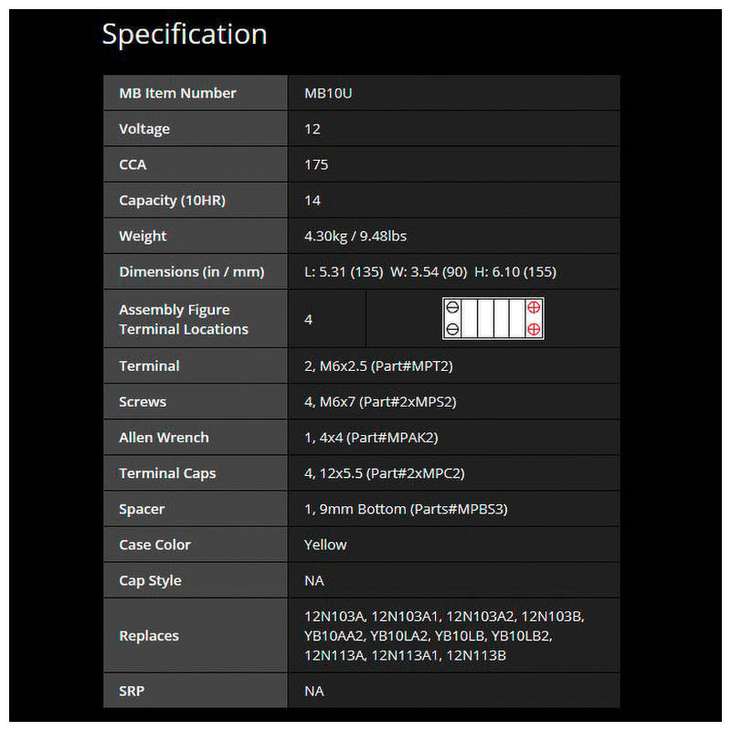 4-polig (mit 9mm Bodenabstandshalter), Kaltstartstrom 175 Ampére bei Minus 18 Grad. Ersetzt oder enspricht dem Japancode oder DIN: 12N103A, 12N103A1, 12N103A2, 12N103B, YB10AA2, YB10LA2, YB10LB, YB10LB2, 12N113A, 12N113A1, 12N113B