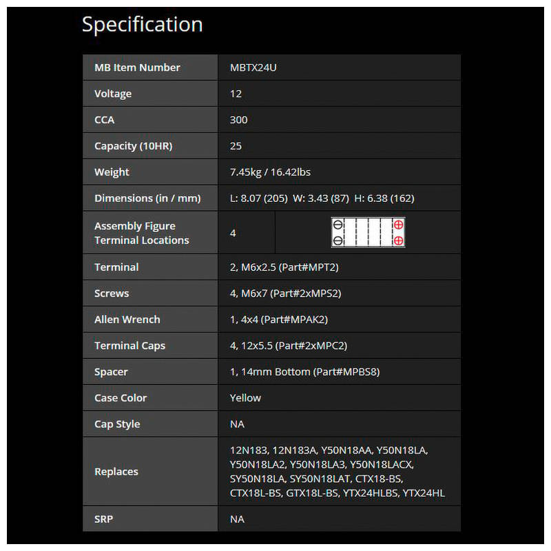 4-polig (mit 14mm Bodenabstandshalter), Kaltstartstrom 285 Ampére bei Minus 18 Grad. Ersetzt oder enspricht dem Japancode oder DIN: 12N183, 12N183A, Y50N18AA, Y50N18LA, Y50N18LA2, Y50N18LA3, Y50N18LACX, SY50N18LA, SY50N18LAT, CTX18-BS, CTX18L-BS, GTX18L-BS, YTX24HLBS, YTX24HL