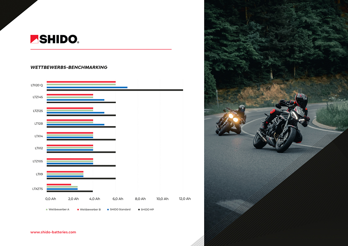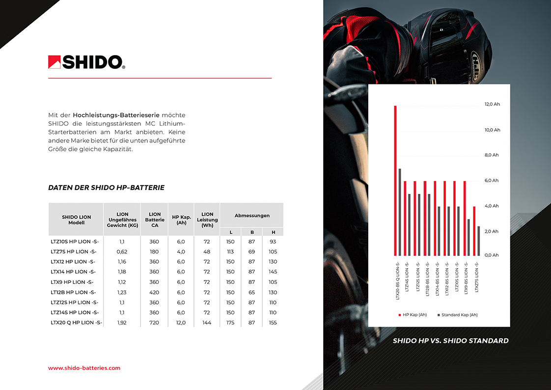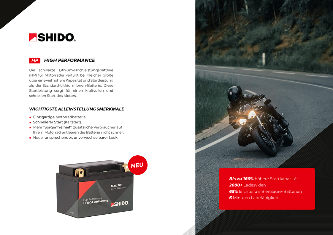 Die schwarze Lithium-Hochleistungsbatterie (HP) für Motorräder verfügt bei gleicher Größe über eine viel höhere Kapazität und Startleistung als die Standard-Lithium-Ionen-Batterie. Diese Startleistung sorgt für einen kraftvollen und schnellen Start des Motors.