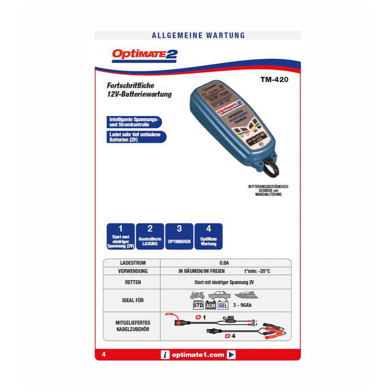 Batterieladegerät *tecMATE* OPTIMATE 2 12V/0.8A, für STANDARD, GEL, AGM Batterien mit 3-96Ah