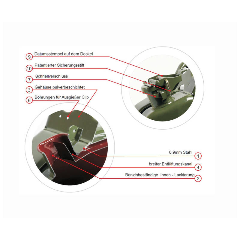 Ausgestattet mit einem original Jerrycan-Verschluss und mit Sicherungsstift