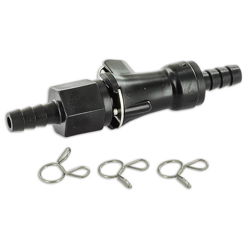 Benzinschlauchschnellkupplung mit zwei Schlauchsicherungen. Die Verriegelung erfolgt per Chromstahlblech.