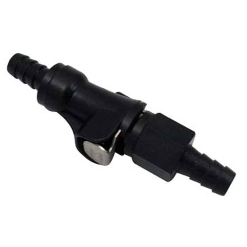Benzinschlauchschnellkupplung mit zwei Schlauchsicherungen. Die Verriegelung erfolgt per Chromstahlblech.