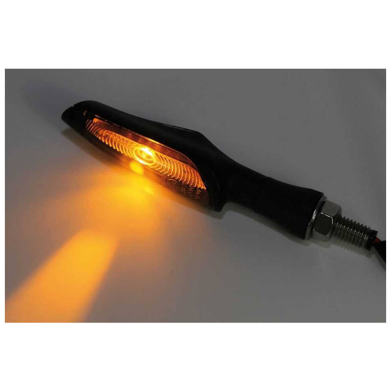 KOSO LED Blinker INFINITY, schwarzes Metallgehäuse mit Gummistiel, getöntes Glas, E-geprüft für vorne und hinten. Stück. Maße: B. 74 mm x H.20 mm x T. 24 mm. Ges.Breite (mit Gummistiel 19 mm): 93 mm. M 8x 1,25 Gewindebolzen. 12V / 2W Belegung: rotes Kabel = Blinker (+) schwarzes Kabel = Masse (-)