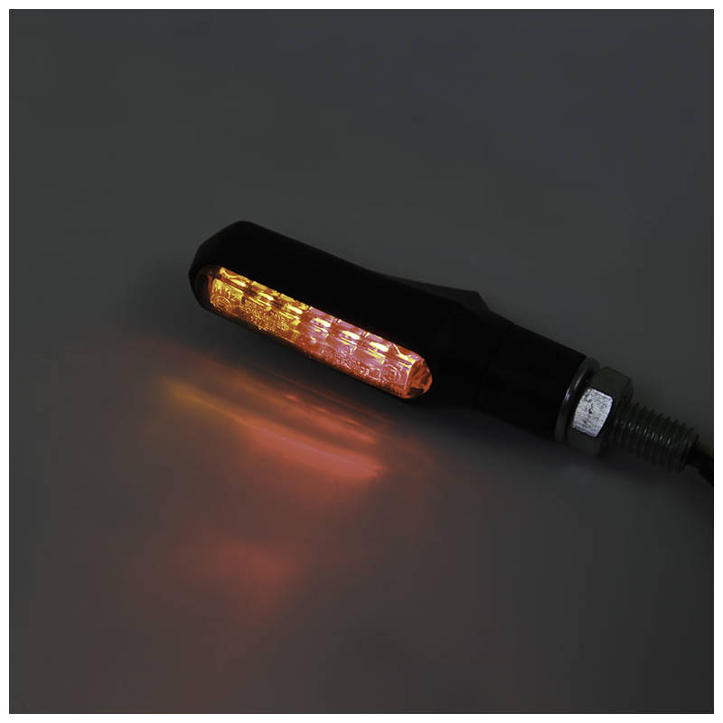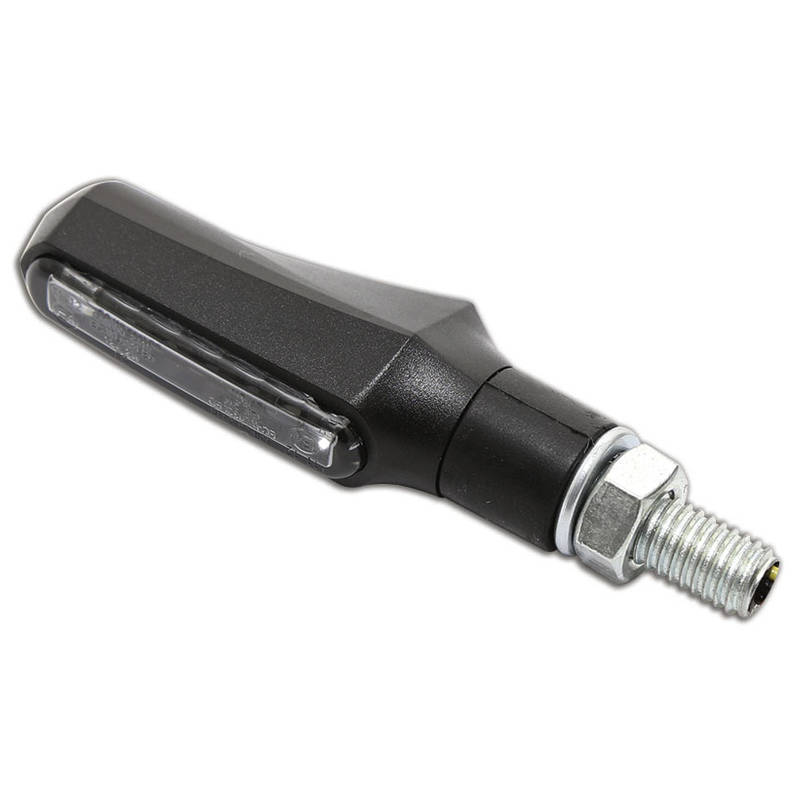 Ein modern designter Blinker mit Rücklichtfunktion und neuster Lichttechnik im robusten Kunststoffgehäuse in Schwarz, mit Gummistiel und getöntem Glas ist E-geprüft, vorgesehen für hinten.