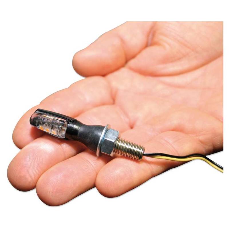 Modernste Lichttechnik in extrem kleinen Maß verpackt. Ein optisches Highlight an jedem Motorrad. Mini-Blinker mit schwarzem Kunststoffgehäuse und transparentem Glas, E-geprüft.