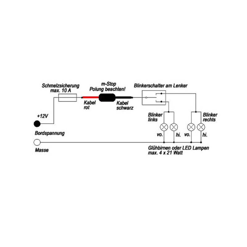 Der m-Stop ist ebenso als BLINKRELAIS MIT AUTOMATISCHER ABSCHALTUNG verwendbar! Sicherheitsaspekt! Blinkgeber schaltet bei entsprechender Einstellung nach 20 Sekunden automatisch den/die Blinker ab. Nie mehr versehentliches Dauerblinken!
