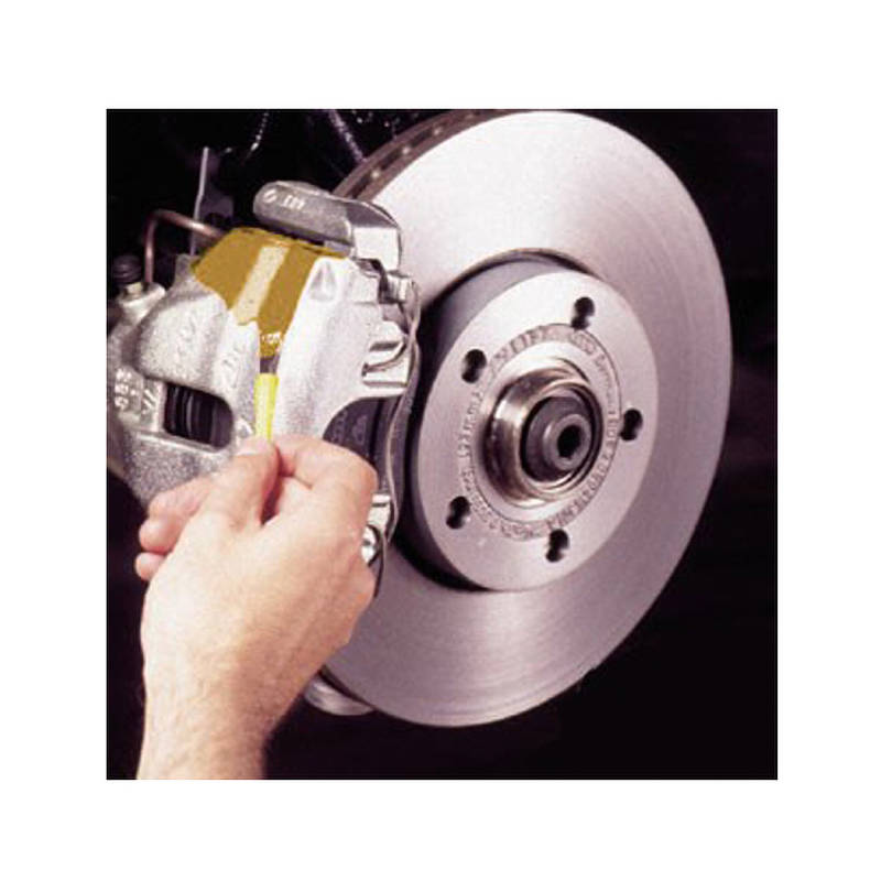 Auto gemäß Hersteller-Vorschrift aufbocken und das Rad abmontieren. Bremsbeläge müssen nur entfernt werden, wenn auch die Innenseite der Bremssättel lackiert werden. Staubschutzmanschetten, Gummibremsleitungen und Gewinde der Entlüfterschraube sorgfältig abkleben. Dose ca. 2 Minuten gut schütteln – auch während der Anwendung. Bremssattelreiniger wird direkt auf die Verschmutzungen gesprüht. Die zu behandelnden Oberflächen gleichmäßig einsprühen und anschließend überschüssigen Bremssattelreiniger abtropfen lassen. Hartnäckige Verschmutzungen mit einem Pinsel oder einer Bürste nachbehandeln.