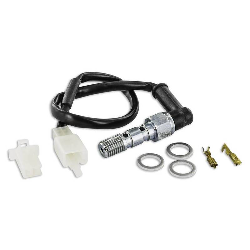 Doppelhohlschraube für Bremsleitung M10x1.25 mit integriertem Bremslichtschalter inkl. Kabel und Steckereinheit. 3 Aludichtringe sind im Lieferumfang enthalten.