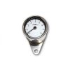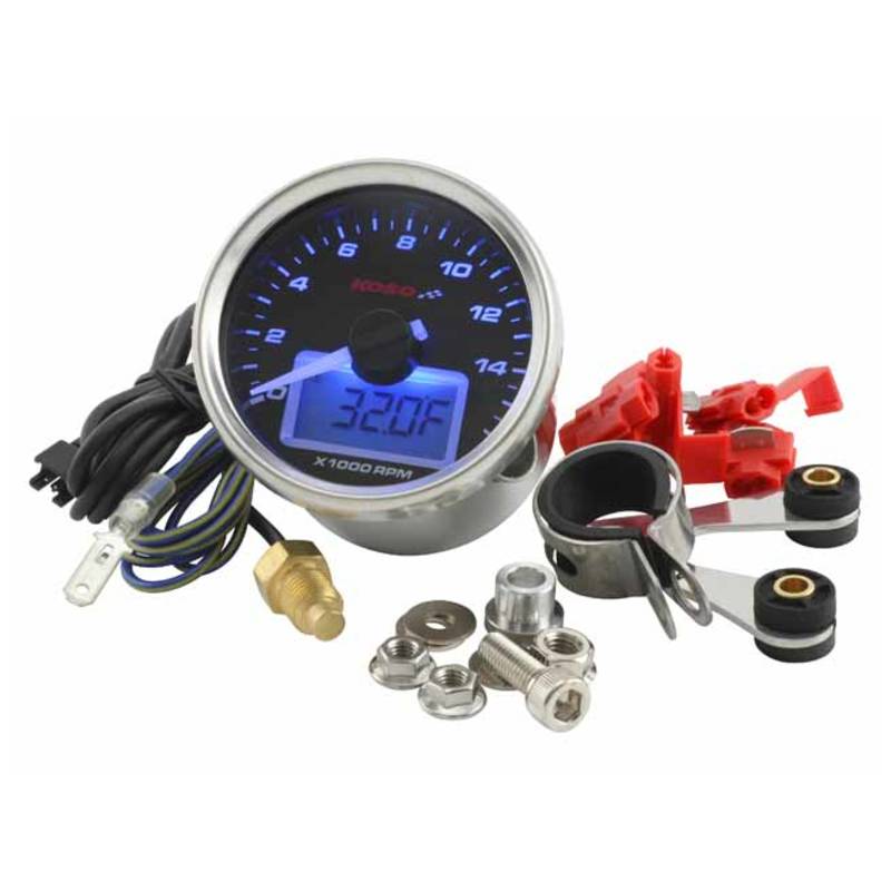 Digitaler Drehzahlmesser mit analoger Anzeige von KOSO im GP-Style. Beim Einschalten des Drehzahlmessers bzw. der Zündung führt die Elektronik einen Selftest durch, in dem der Zeiger einmal seinen kompletten Bereich auf und ab läuft. Die Temperatur wird Digital in einem kleinem Display unterhalb des Zeigers angezeigt.