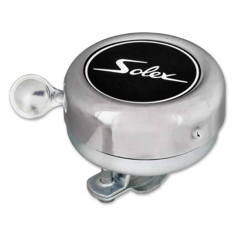 Schön verchromte Klingel mit weissem Solex Logo auf schwarzem Grund.