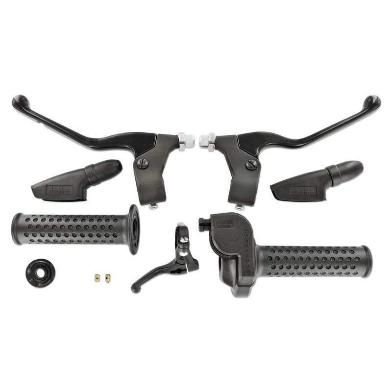 Bestehend aus einem Gasdrehgriff, zwei Bremshebel und einem kleinen Starterhebel sowie den zwei Gummibezügen.