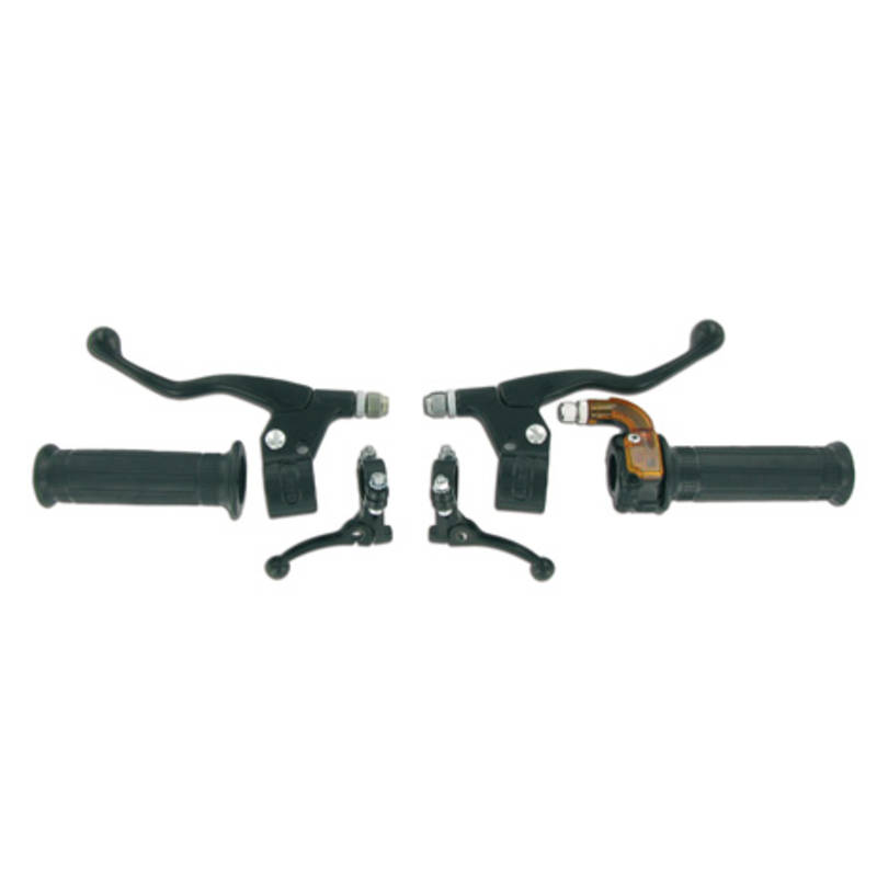 Bestehend aus einem Gasdrehgriff, zwei Bremshebeln und zwei kleinen Starterhebeln sowie den zwei Griffen.