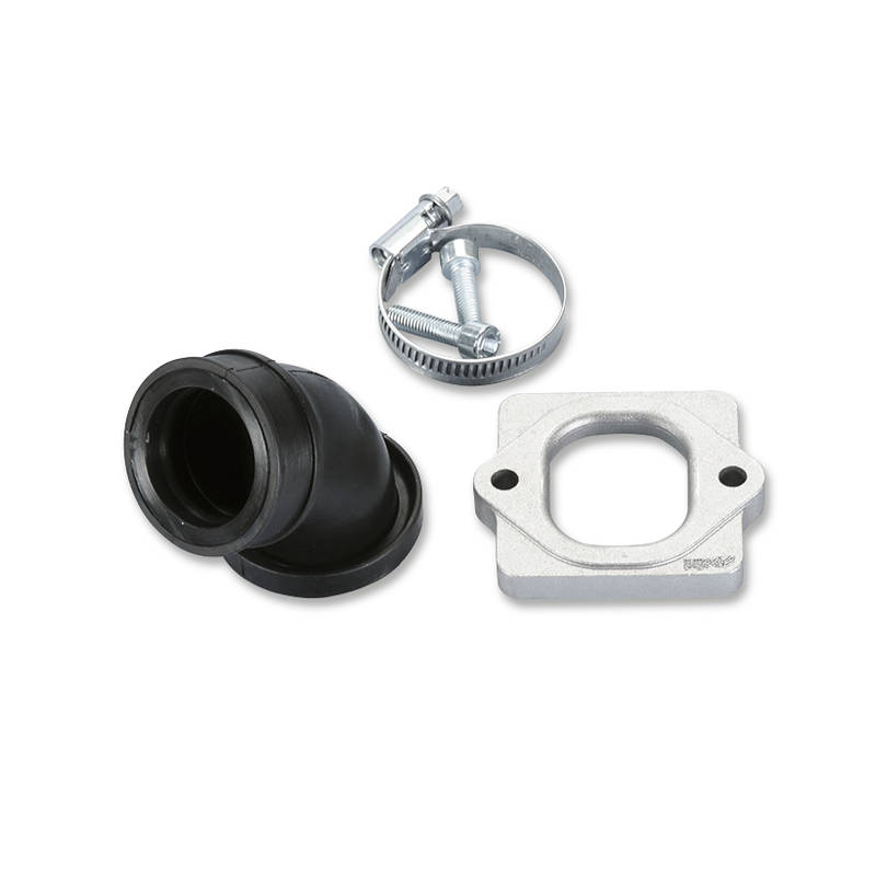Polini bietet ebenfalls zweiteilige Ansaugstutzen an, die aus einer Grundplatte und einem flexiblen, gewinkelten Gummistück bestehen, welche beim Verschrauben zwischen Grundplatte und Motoreinlass gequetscht werden.