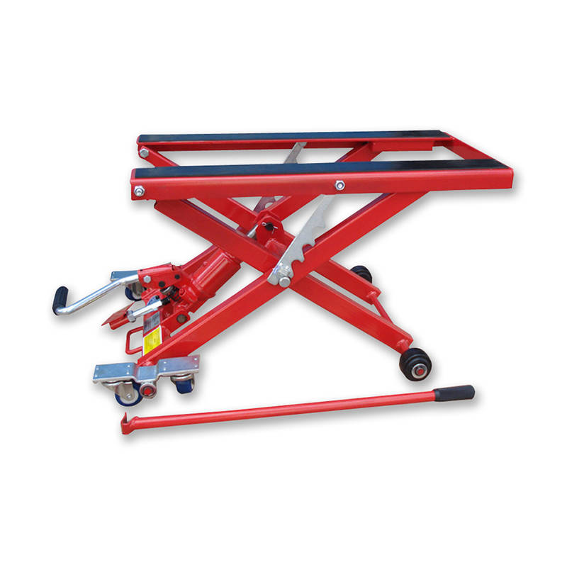 Sehr stabiler Motorradhebelift für Motorräder bis 500 kg. Eine Gummischicht auf den U-Aufnahmen verhindert jegliches Abrutschen und Verkratzen. Der Lift wird durch Pumpen mit einem Fusspedal hochgefahren.