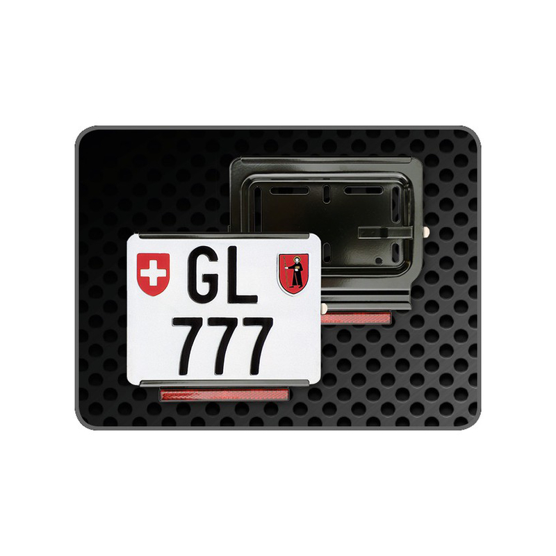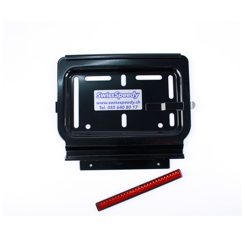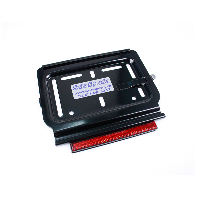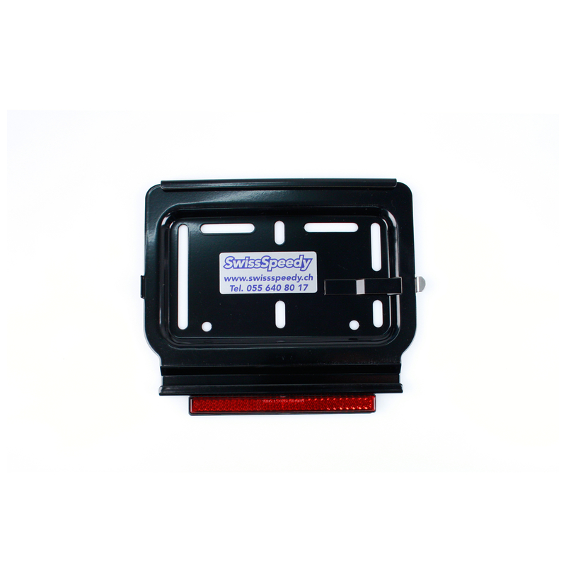 Kennzeichenrahmen SwissSpeedy Motorrad-Format aus CHROMSTAHL SCHWARZ für Rechts-Einschub mit Rückstrahler