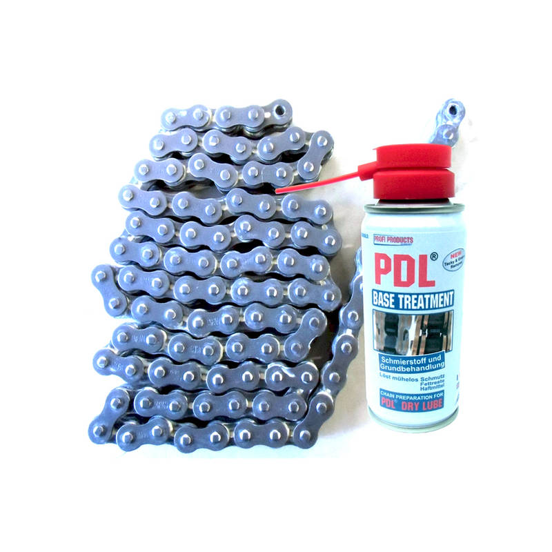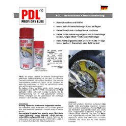 Oberflächliche Verschmutzungen und klebrige Kettensprays werden nach dem Besprühen einfach von der Kette abgewischt. Während dem Fahren und nach einem erneuten Besprühen reinigen sind die Schmierspalte (unter den äußeren Kettenrollen) von selbst. PDL Base Treatment (DBGM geschützt und in Deutschland hergestellt) wirkt beim Fahren – als Schmierstoff und in reinigender Funktion. Die Kettenrollen sind nach kurzer Zeit wieder leichtgängig, sauber und gleitfähig.
