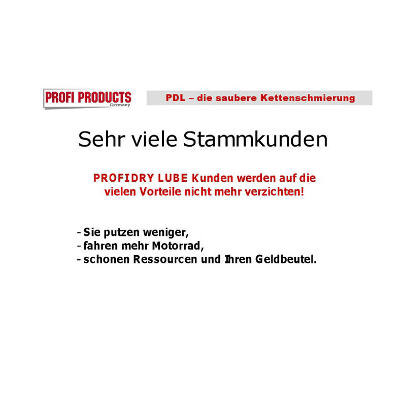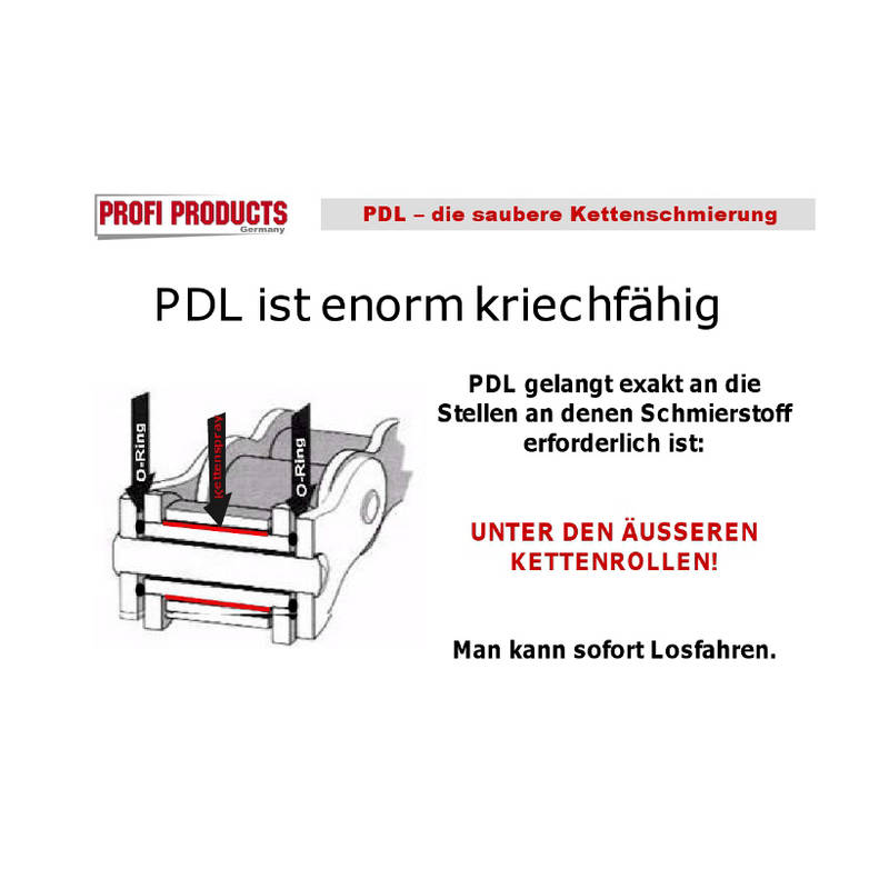 Profi Dry Lube ist der Kettenschmierstoff auf PTFE Basis, der im Gegensatz zu den technisch veralteten, weißen Haftschmierstoffen keinen Schmutz bindet. Es entsteht keinerlei Schmirgelwirkung – wodurch die Dichtringe (O-, X Ringe) eine vielfach höhere Standzeit erreichen.