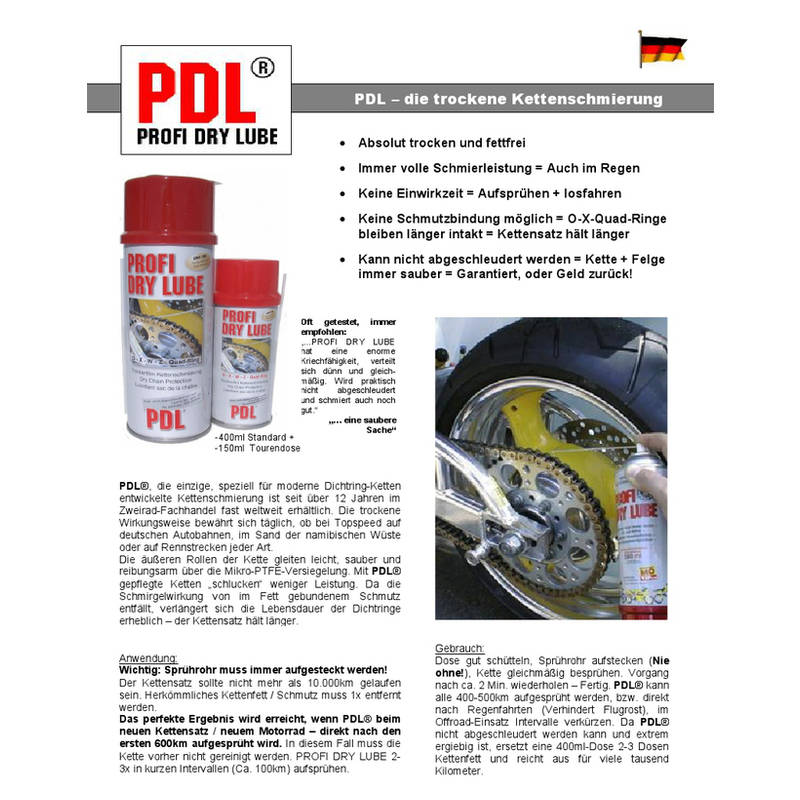 Kettenspray Profi Products PDL eingzigartiger, trocken und farbloser Schmierstoff speziell für O-Ring Ketten (400ml)