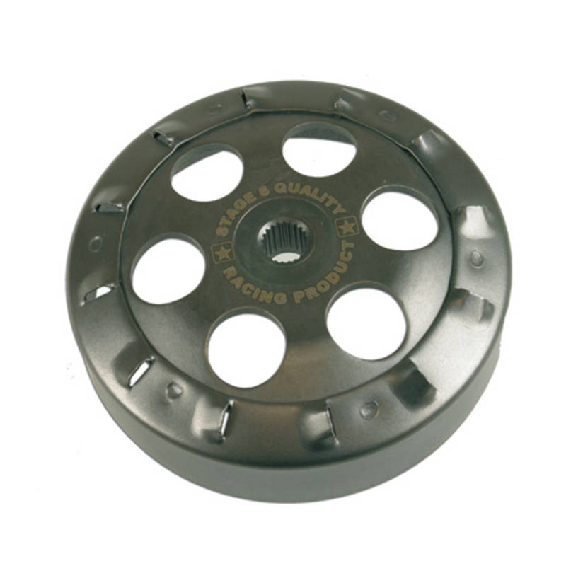 Die WingCooler Kupplungsglocke von Stage6 besitzt neben einem verstärkten Mantel ein patentiertes Kühlkonzept. Die Luft wird durch die seitlich angebrachten Lüfterschaufeln und vergrößerte Bohrungen zu den Kupplungsbelägen geführt. Eine längere Lebensdauer der Kupplung und die Verringerung des bekannten Kupplungsschlupfes bei warm gefahrenen Motoren sind das Resultat. Die Temperatur der Glocke wird deutlich gesenkt, was zu weniger Verlustenergie und damit natürlich mehr Leistung am Hinterrad führt. Besserer Anzug auch bei warm gefahrenen Motor. Zusätzlich wurde die Glocke von innen gestrahlt um den Grip der Kupplungsbeläge zu erhöhen. Die geringe Masse von nur 395 Gramm (zum Vergleich Malossi Wingbell 575 Gramm, Polini Evolution 485 Gramm) wirkt sich positiv auf die Beschleunigung des Motors aus.