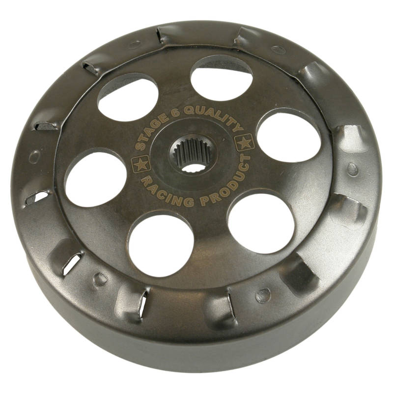 Die WingCooler Kupplungsglocke von Stage6 besitzt neben einem verstärkten Mantel ein patentiertes Kühlkonzept. Die Luft wird durch die seitlich angebrachten Lüfterschaufeln und vergrößerte Bohrungen zu den Kupplungsbelägen geführt. Eine längere Lebensdauer der Kupplung und die Verringerung des bekannten Kupplungsschlupfes bei warm gefahrenen Motoren sind das Resultat. Die Temperatur der Glocke wird deutlich gesenkt, was zu weniger Verlustenergie und damit natürlich mehr Leistung am Hinterrad führt. Besserer Anzug auch bei warm gefahrenen Motor. Zusätzlich wurde die Glocke von innen gestrahlt um den Grip der Kupplungsbeläge zu erhöhen. Die geringe Masse von nur 395 Gramm wirkt sich positiv auf die Beschleunigung aus.