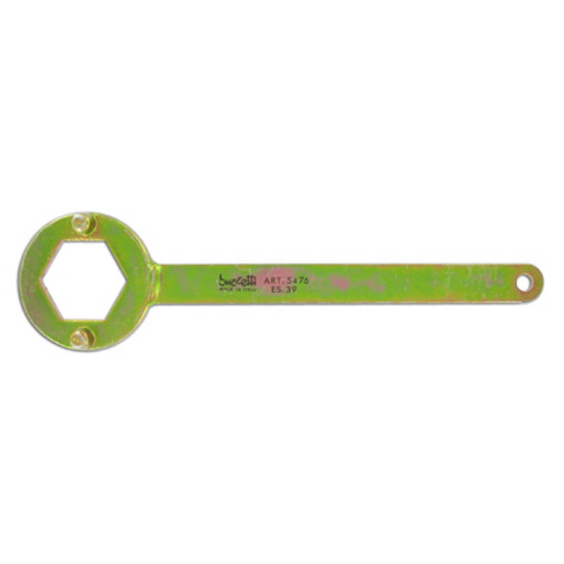 Die Kupplungshalter von Buzzetti sind zwei Werkzeuge in einem. Die Zapfen greifen in die Kupplungsglocke, dadurch läßt sich die Glocke einfach blockieren und die Mutter öffnen. Zum zweiten läßt sich mit dem Schlüssel die große Mutter der Kupplung entfernen.