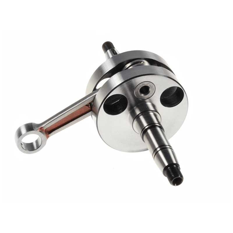 Racing Kurbelwelle mit 16mm Hubzapfen und verstärktem Pleuel. Das vordere Pleuelauge wurde verstärkt (Wanddicke erhöht), um beim Umbau auf grössere Bolzenlager mehr Stabilität und Reserven zu haben. Ausserdem kommt das hintere Pleuelauge neu mit 2 Schmierkerben, um das Silberlager noch besser zu spülen. Auch das seitliche Pleuelspiel wurde optimiert. Die neuen Silberlager verfügen über noch höhere Notlaufeigenschaften und sind Drehzahlfest bis ca. 16000rpm.