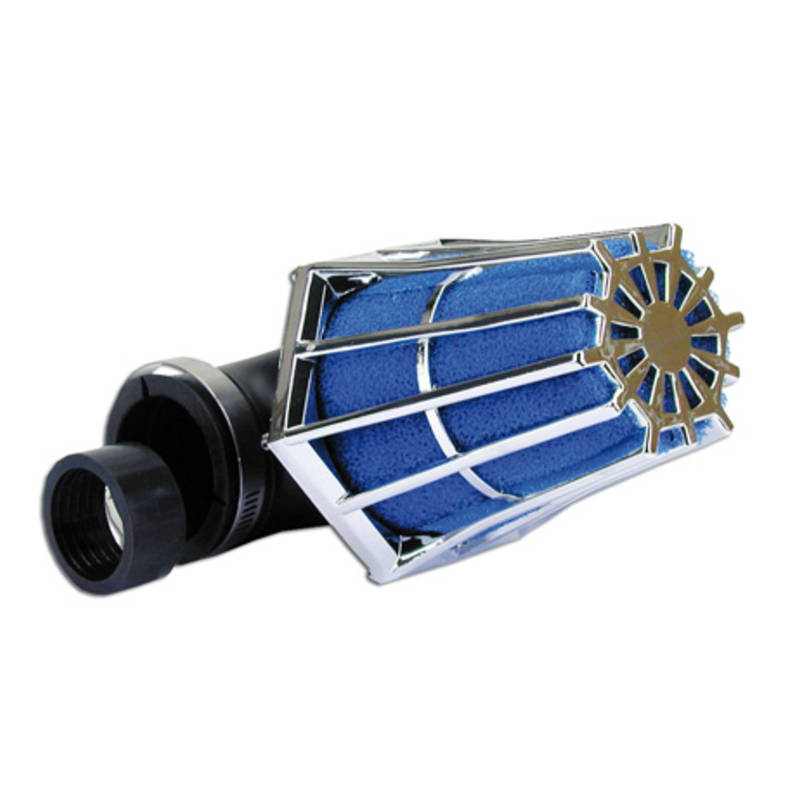 90° abgewinkelter Rennluftfilter mit Kunststoffkäfig. Für Vergaser mit 28-35mm Anschlussweite.