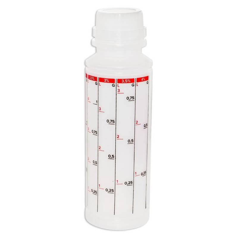 Die jeweilige Literanzahl wird je Skala dem Mischverhältnis gegenübergestellt, somit wird das korrekte Mischen zu einem Kinderspiel.