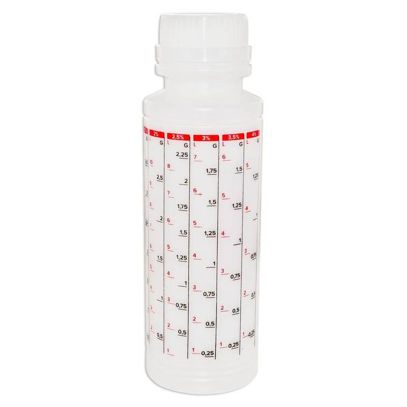 Die jeweilige Literanzahl wird je Skala dem Mischverhältnis gegenübergestellt, somit wird das korrekte Mischen zu einem Kinderspiel.