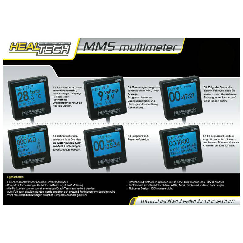 Multimeter *HEALTECH* MM5 5+1 Funktionen: Temperatur, Spannung, Fahrzeit, Stunden Zähler, Stoppuhr und Laptimer