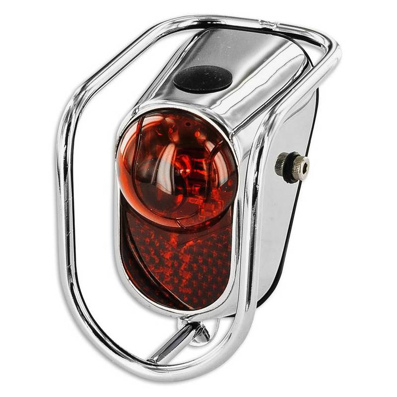 Klassisches, schlichtes Rücklicht im Oldschool-Look. Das Rücklicht ist aus verchromtem Stahlblech gefertigt. Im Rücklichtglas ist ein Rückstrahler integriert.