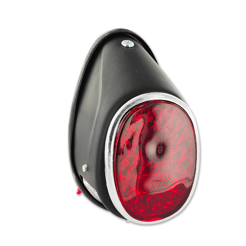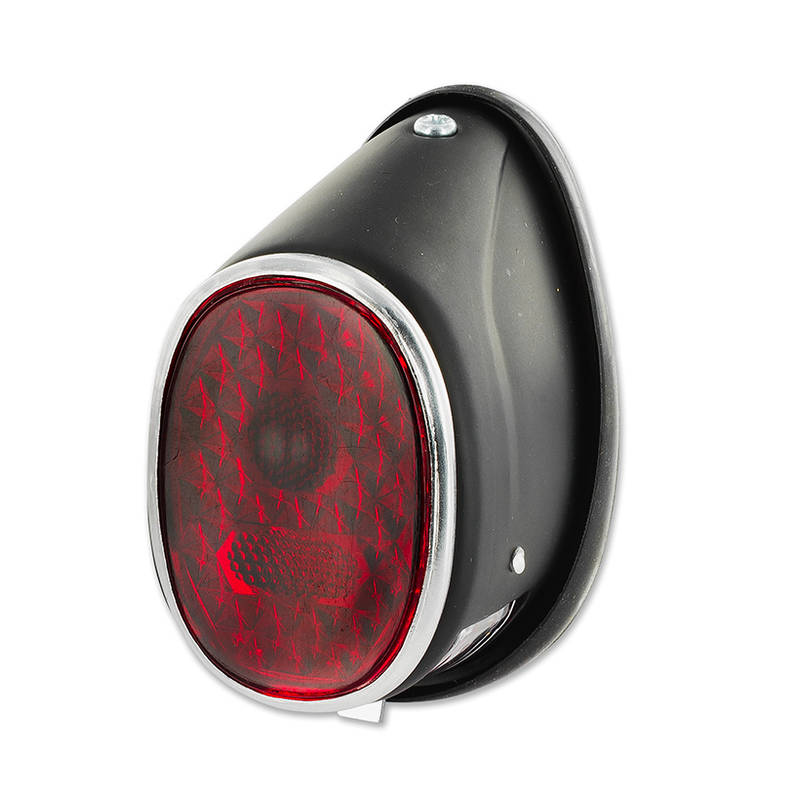 Klassisches, schlichtes Rücklicht im Oldschool-Look. Das Rücklichtglas ist in einem Aluminium Rahmen eingearbeitet. Das Kennzeichen des Fahrzeuges wir durch ein unten am Rücklicht angebrachtes transparentes Glas beleuchtet. Dieses Rücklicht ist ähnlich wie die alten CEV, Hella oder ULO Rücklichter.