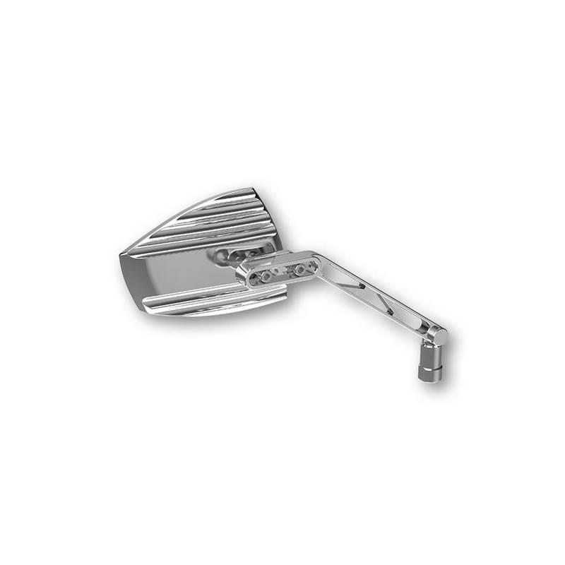 Die asymmetrisch gehaltene Form und die CNC gefrästen Linien des Gehäuses kreieren sowohl einen modernen als auch einen klassischen Look. Getragen wird der Spiegelkopf von einem Aluminiumarm, der klassisch per M10x1.25 Adapter in die Lenkerarmatur verschraubt wird.