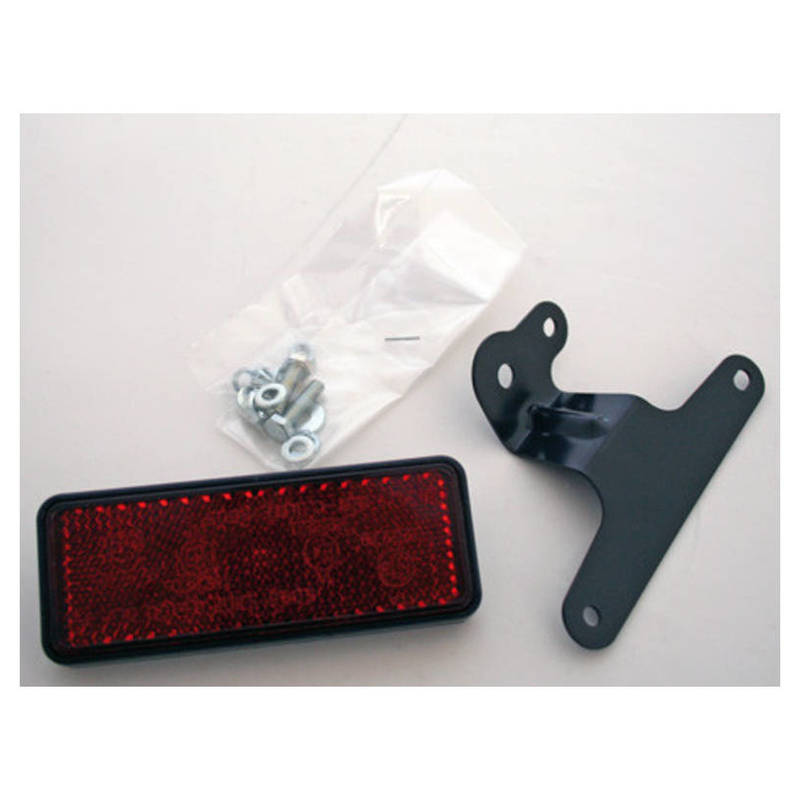 Rückstrahler rechteckig in rot mit schwarzem Rahmen inkl. Halterung aus Blech, E-geprüft