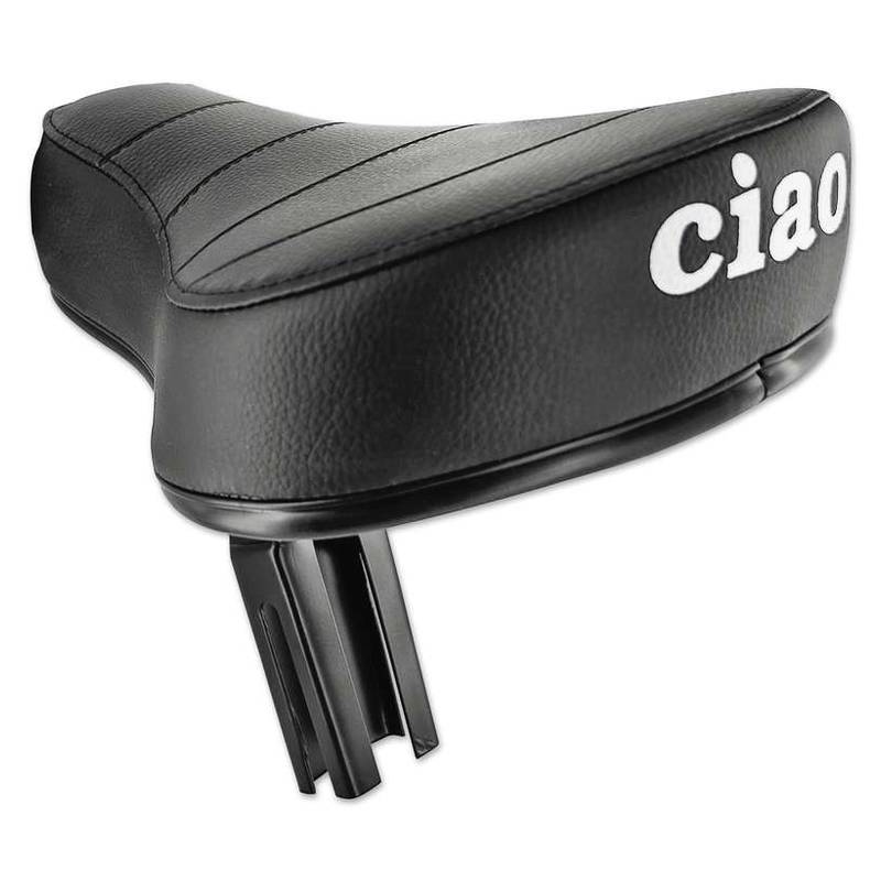 Der Sattel mit integrierter Feder für die alten ungefederten «P» Modelle. Überzogen mit schwarzem Kunstleder. Mit der Aufschrift Ciao auf der Rückseite des Sattels. Die Sitzhöhe beträgt ca. 5cm mehr als original.