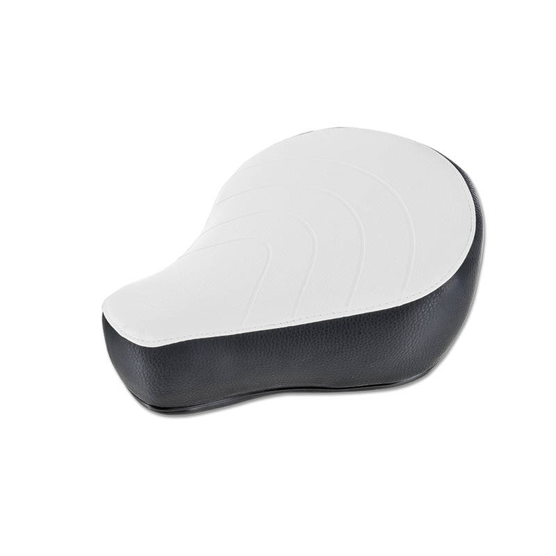 Sattel im originalen Look der alten Maxi N und 2-Gang Modelle oben mit weissem Leder bezogen. Der Sattel ist schön verarbeitet und hat auf der Hinterseite einen weissen «PUCH» Schriftzug.