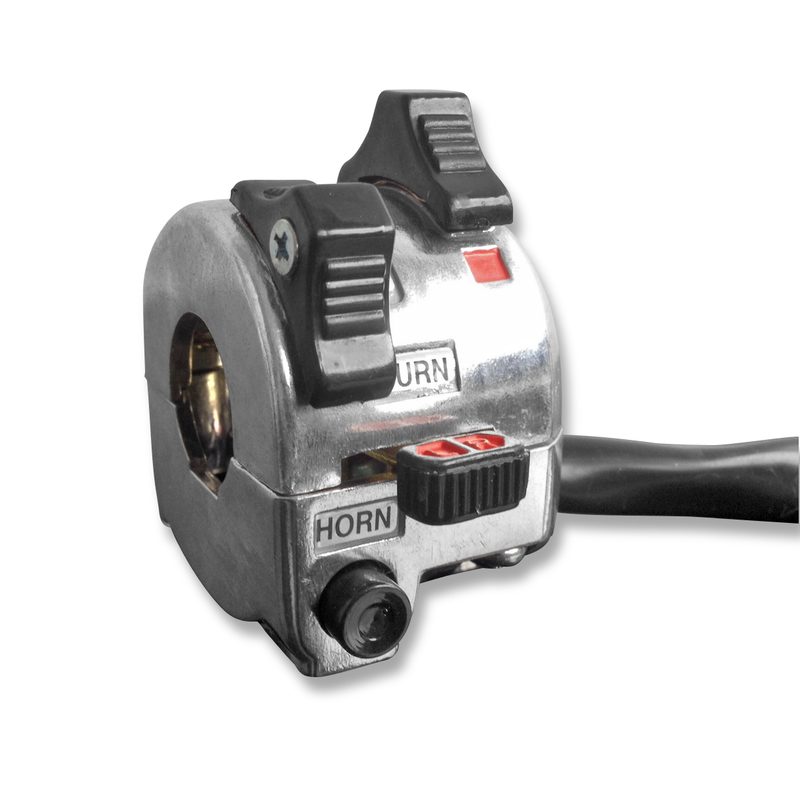 Formschöne Lenkerarmatur mit Blinker-, Fernlicht-, Killschalter und Hupe, sehr ähnlich den Armaturen von Yamaha. Die Armatur ist solide verarbeitet, das Gehäuse besteht aus leicht poliertem