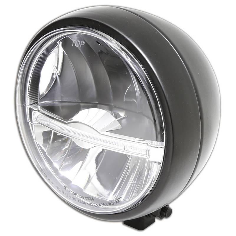 Der Klassiker für alle Cruiser-Modelle – runder LED-Hauptscheinwerfer mit schwarzem Metallgehäuse und verchromtem Einsatz sowie klarem Glas, zur unteren Befestigung. Das LED-Standlicht ist in der Mitte des Einsatzes als Lichtleiste (Light Guide System) dargestellt. Der Scheinwerfer verfügt über einen asymmetrischen Prismenreflektor, E-geprüft.