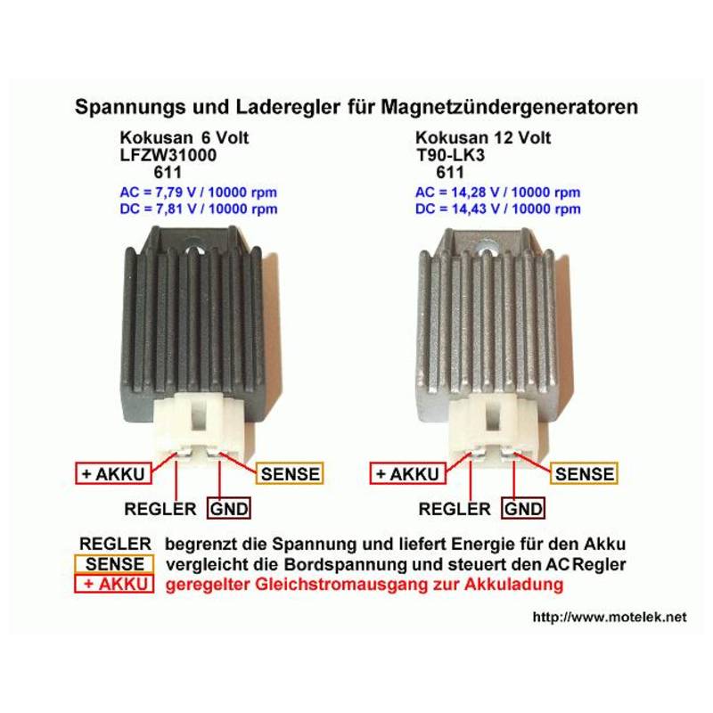 Diese Spannungsregler-Gleichrichter-Einheit Kokusan LFZW31000 611 begrenzt die Spannung zuverlässig auf 7.8 Volt und richtet den Strom gleich. Die Lebensdauer der Glühlampen wird deutlich erhöht, zudem kann eine 6 Volt Batterie optimal geladen werden.