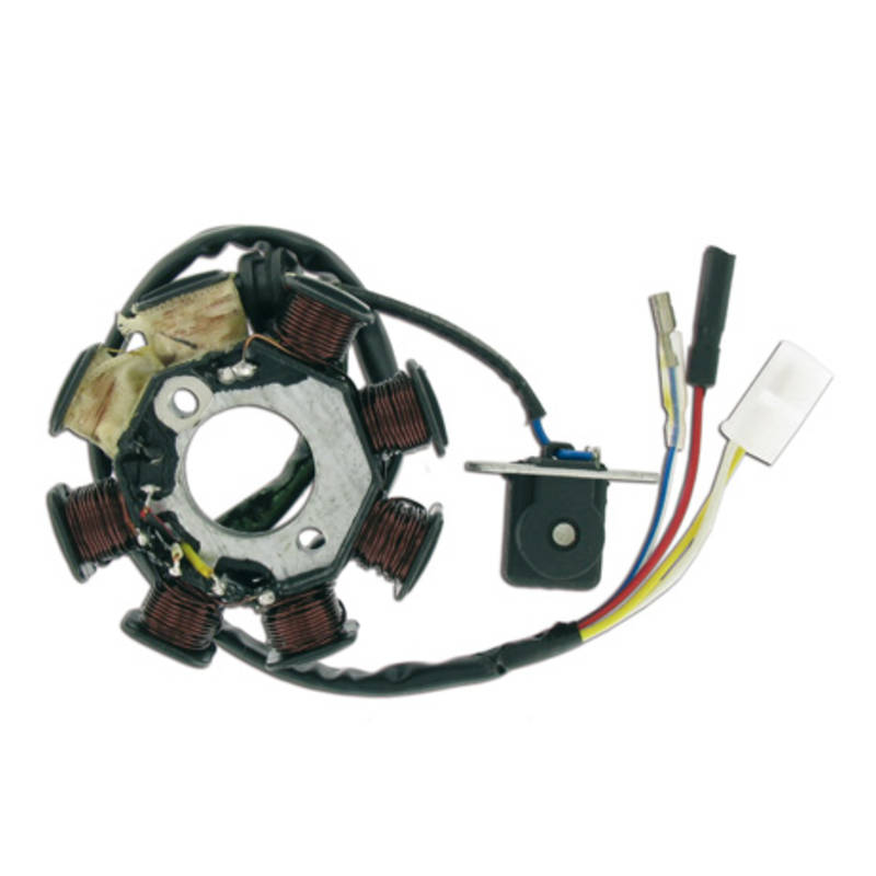 Lichtmaschine mit Kabelanschluss/Stecker und Pickup Sensor. Die Lichtmaschinen gibt es momentan in 2 verschiedenen Versionen. Version 1 verfügt am Haupt- Verbindungsstecker [Farbe weiß] über 2 Kabelkontakte und Version 2 verfügt über 3 Kabelkontakte. Zur Sicherheit bitte den Stecker am Fahrzeug prüfen ob er über 2 oder 3 Kabel verfügt.