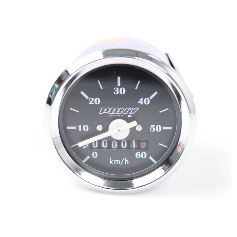 Tacho-Kopf Typ VDO Ø 60mm bis 60 km/h (Zifferblatt: schwarz / Ring: verchromt / Anschluss exzentrisch) mit Pony Logo und Tachobeleuchtung.