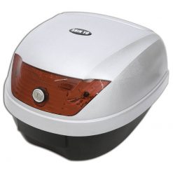 Schwarzes Top Case mit 28 Liter Volumen und rotem Reflektor. Es bietet Stauraum für 1 Helm.